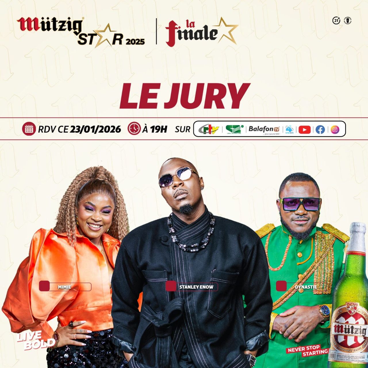 Le rideau se lèvera à 19 h, pour une soirée qui sera retransmise partout dans le monde via les plateformes digitales de MützigSTAR et les grands écrans nationaux tels que la CRTV, Canal 2, Balafon TV et Vision 4.